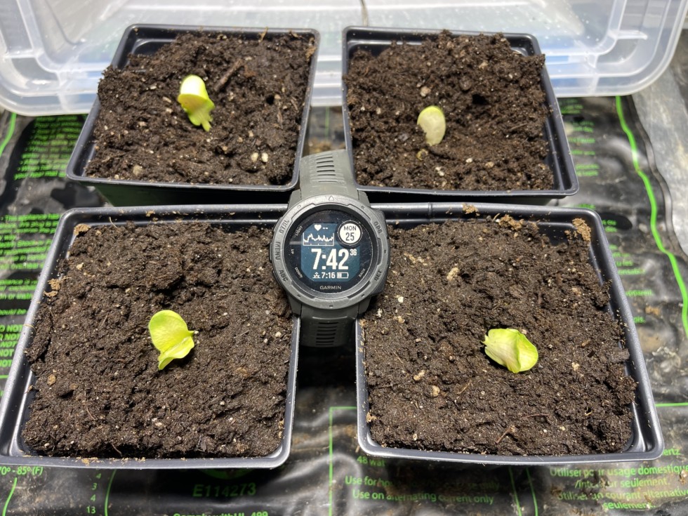 68 hours from the time I started sanding the seeds all 4 are up and have shed their seed coats. 2245 Andrusz / on Left 1109 McMillin / on Right They have been transferred to my Mars Hydro grow tent where they will be at 300 ppfd for 18 hours a day LED on / 6 hours a day LED off. This is the recommended DLI for pumpkin seedlings. They will be in this container for a total of 8 days from the time the seeds were sanded. On the 8th day (April 1st) they will be transplanted outside to my greenhouse.