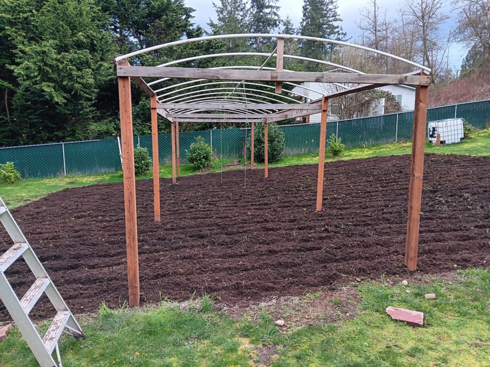 I rebuilt the armature for the greenhouse. The ends were ripped out of the ground by a windstorm last summer. I used 4�4s this time. Also used the opportunity to slide the whole thing a couple feet to the south. Should have about 4 feet of extra width for the two plants in the big green house.