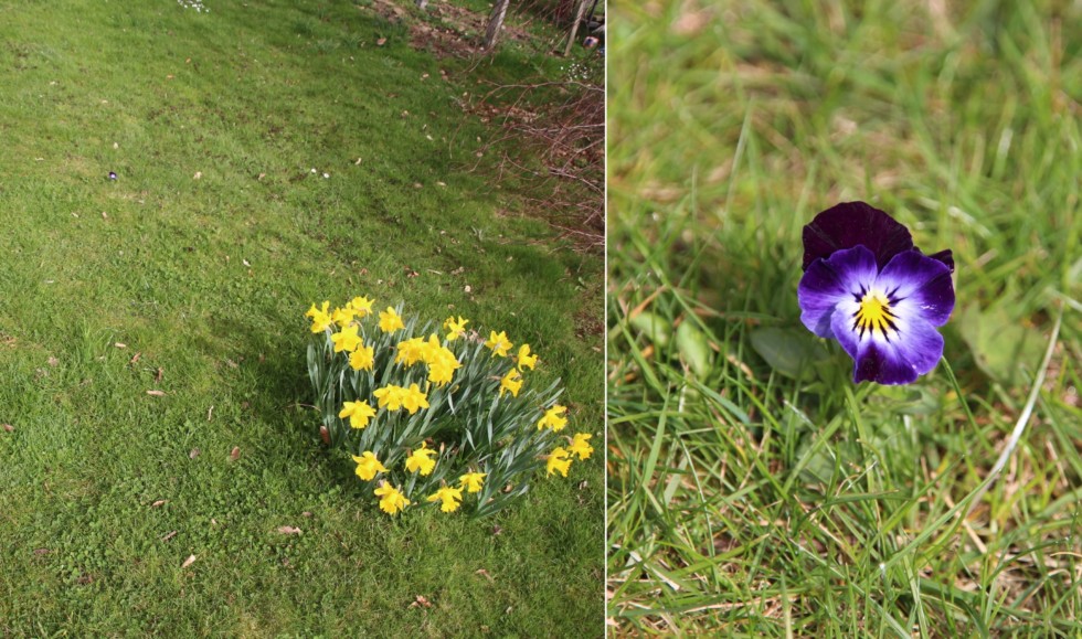 On my way back from the patch I discovered an early "Easter egg" in my garden. The first little pansy flower popped open in the lawn.