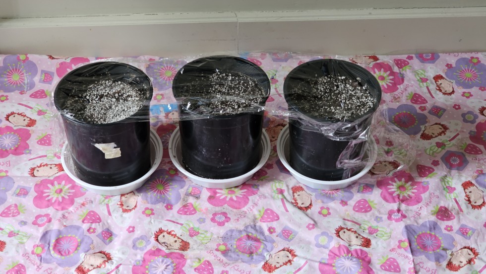 Prepare 1 gallon pots by washing them clean with dish soap and water. Fill with ProMix potting soil. Soak the ProMix until water flows out of the holes in the bottom of the pot. Discard the water in the trays. Cover with plastic wrap to prevent drying. Leave them on a heated floor or heat matt for the 2 days while you're waiting for the seeds to germinate.