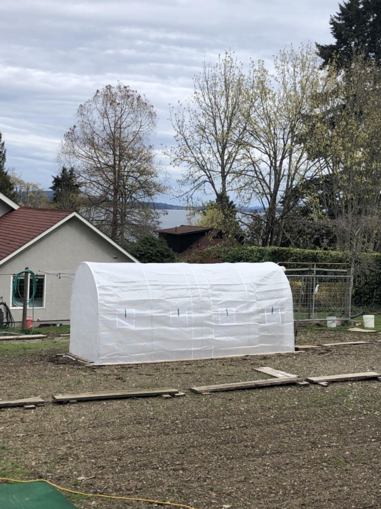 We put the other hoophouse in place and will install the soil heating cables, heater and fan. The 2212 Chan, 1842 Hoornstra and 929 Sandercock are still doing great under lights but I have only room for 2 more plants. Dilemma.