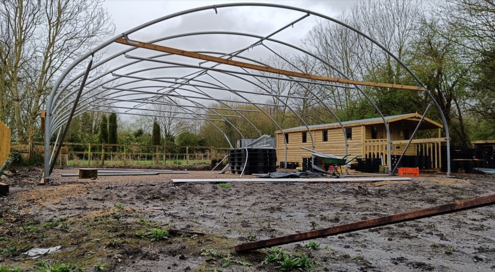 The frame is up, just need to add doors and poly sheeting. Still waiting on electricity (over 6 months now). If no power by end of May then it's another year to wait.