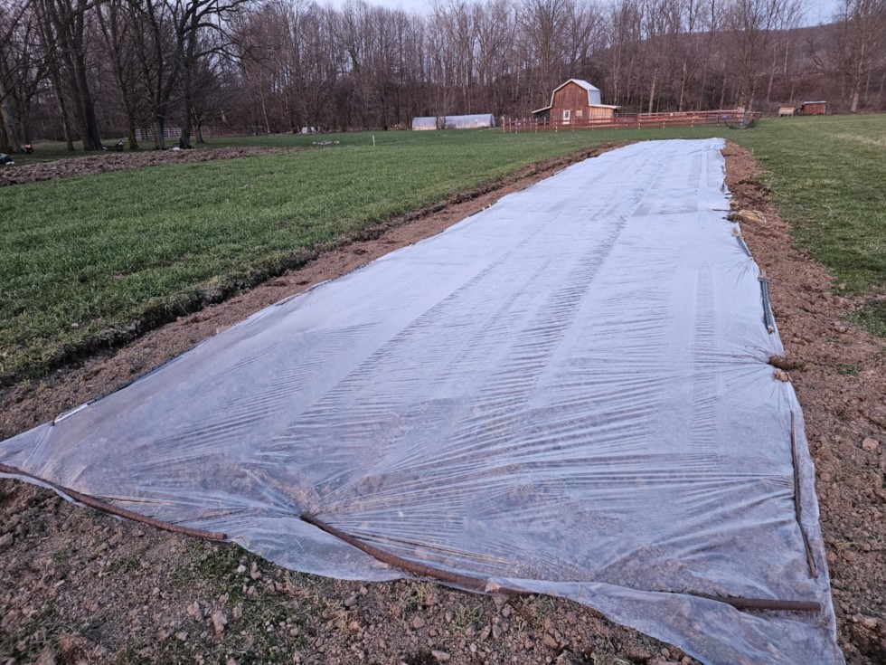 Heating cables in, plugged in, and plastic down. The plastic should buy me a little time to get the little greenhouses patched up.