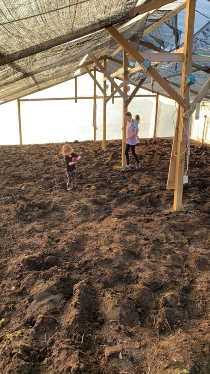 We got the shade cloth up in the greenhouse tonight, we use 30% black every year. The girls were busy looking for worms tonight, the soil still cold with the frost about a foot down. Warming up slowly! We'll get fans up next and try get the amendments down next week so we can till.
