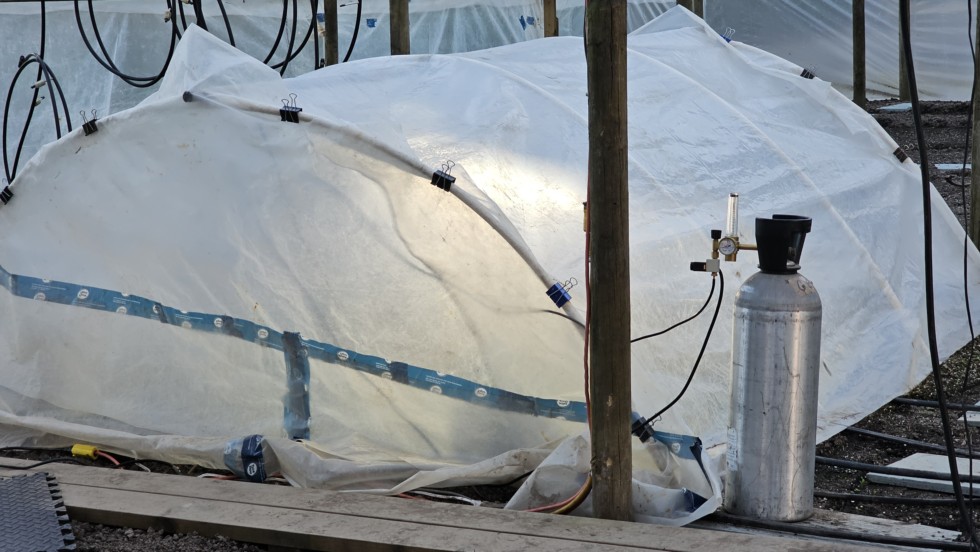 This is my CO2 setup for the hoophouse. The gas regulator is set on the lowest setting and I'm hoping a tank will last at least 10 days. We'll post when the tank empties. The 2 black lines runnig into the greenhouse are power and the other is the CO2 feed. This tube is strapped to the ridge beam to allow the CO2 to drop onto the plant.
