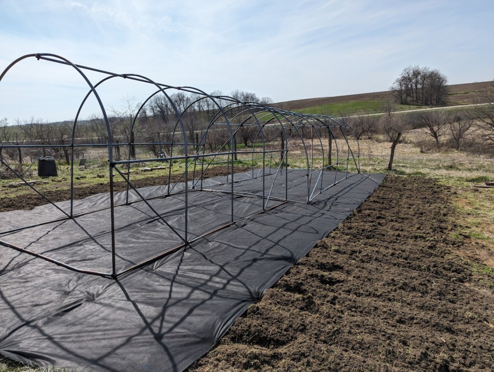 Fabric down, and frames put into place. Going to stake the frames down with fencing T-posts this year to help stabilize and hold in place. Seems like the spring winds we get here are a lot more intense than what they used to be years ago. Will add more fabric at a later date as the plant fills in the space.
