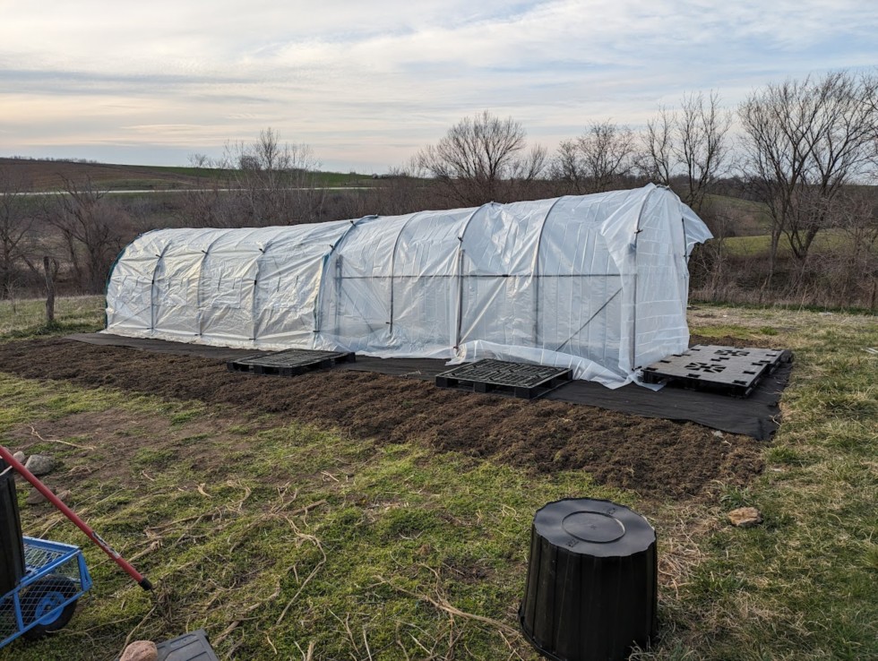 Frames staked in place, and plastic installed. Half of the plastic is the original greenhouse cover, the other half is just plastic sheeting. A lot of clamps in place to hold the plastic and the skirt was weighted down after the pic was taken. Going to hold off planting the pumpkin for a few days as a big storm is forecasted with high winds and hail followed by freezing temps. Don't want the plant in there if this thing fails to hold together.
