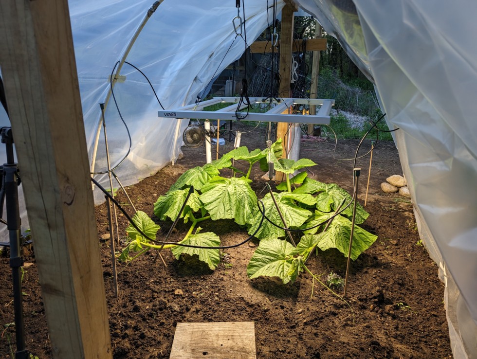 Today is 30 days since the giant pumpkin seeds got started. The 1832.5 plants in the greenhouse with lighting and CO2 are my fastest growing ever. The main vine on one of them is almost 4ft long. They're starting to crowd each other so will have to select a keeper soon.