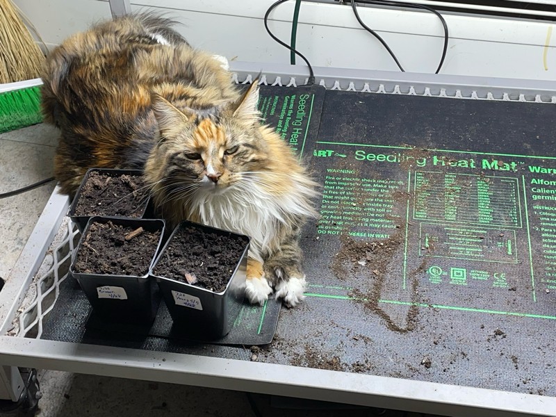 Our cat Penny is such a big help. She loves to sit on the heat mat as we germinate seeds. Here she is helping with our last 3 back up tomatoes.