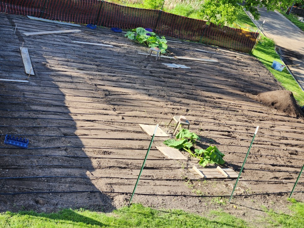 2nd pass with the tiller done, drip down though still need a few things before it's active. Plants took a bit of a beating yesterday as there was a surprise storm. Need wind protection up asap.