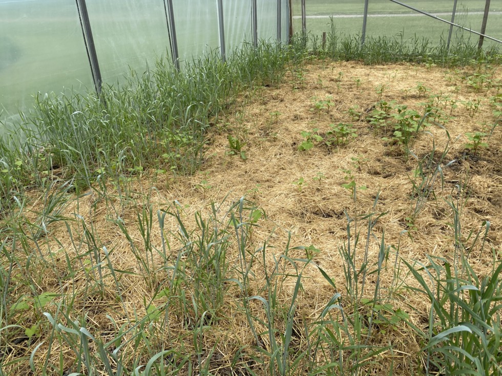 The fall rye did not come back after cutting it down in the greenhouse maybe it was cut too low . The patches outside were not cut as low. The goal is to have living roots in the ground at all times and use a folding saw to cut the roots at ground level so as not to disturb the soil.
