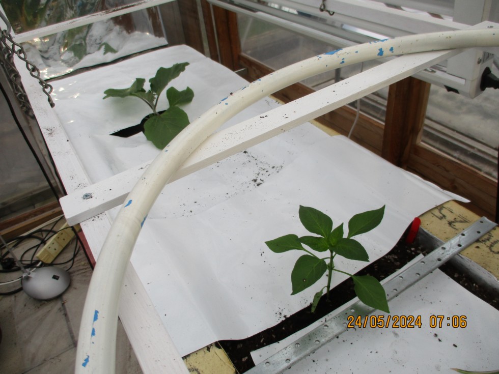 Planted an Aubergine and Pepper in spaces left after double onions removed in soil bed, will see how they grow in this medium as the others will be in Coir.