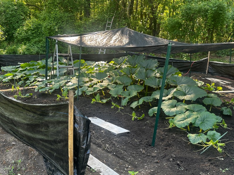 Patch update- The plants are really starting to kick into gear. Last weeks very hot temperatures caused some decent wilting on the leaves of my 1197 so I threw a shade cloth over it. My 1197 is now over 16 feet and over 15 feet wide. The 839 Sandercock is around 15 feet and about 12 feet wide. Few pumpkins in the tip of my 1197. Won't be long until the pollinations begin 1197 shown here