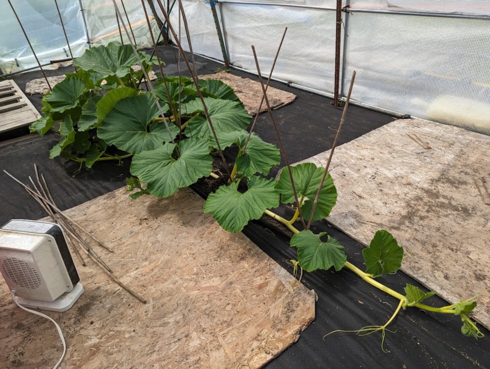 1655.5 Around 9' now. Starting to train the secondaries around in the waterfall pattern. Started using this pattern last couple of years as it seems to be easier to access the vine nodes if you work from back to front when burying and you know it's time to terminate when each vine hits the edge of the patch. Side benefit is it will save space in the narrow greenhouse until it's time to take the cover off. More severe storms on the way so using the greenhouse for weather protection more than temp control at this point.