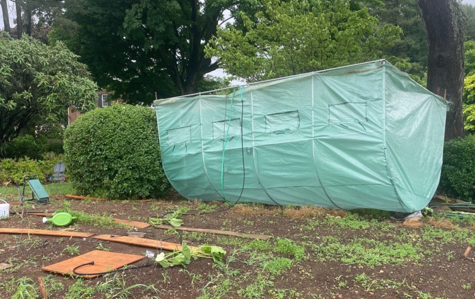 Puff of wind, greenhouse upside down, the 2117 was ripped out of the ground. After 6 seeds started, Left with 2 � the young 1565 and the infant 2040 � the 2040 transplanted in the other direction (actually, that one looks pretty good, just small so far). Gave up on the greenhouse and put up wind fence on what I had still in the ground. Can't believe anyone is following this disaster of a season, except those nasties wondering if I'm the first out. Why do we do this?!!