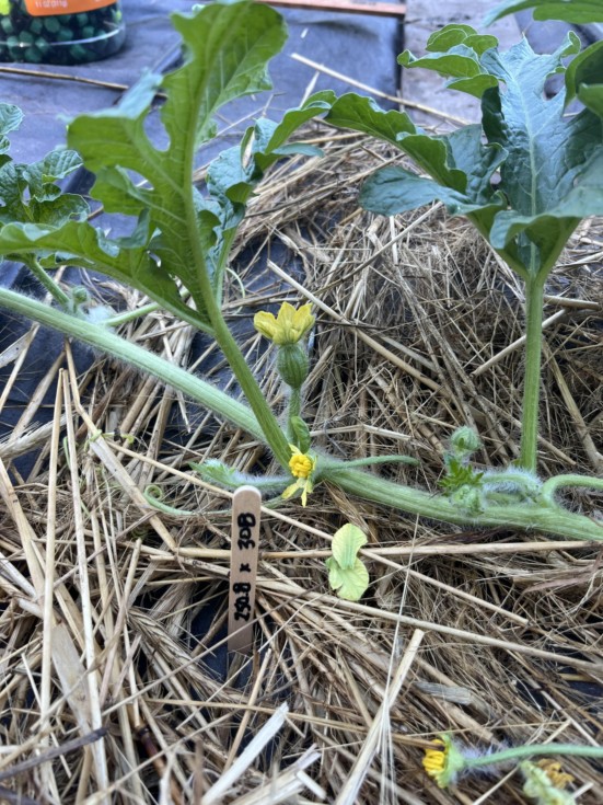 First keeper watermelon 250.8 Kent x 308 Kent at 10 ft on the main vine. Enough plant to sustain it, so hope it takes.