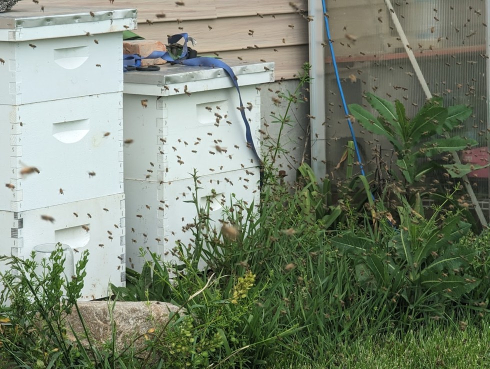 Didn't have to go far, only around the corner of the garage where they seemed to be gathering in front of a hive that had died out this winter. Had left it out for the neighboring hive to clean up and was just thinking it was time to put it away before the wax moths took over.