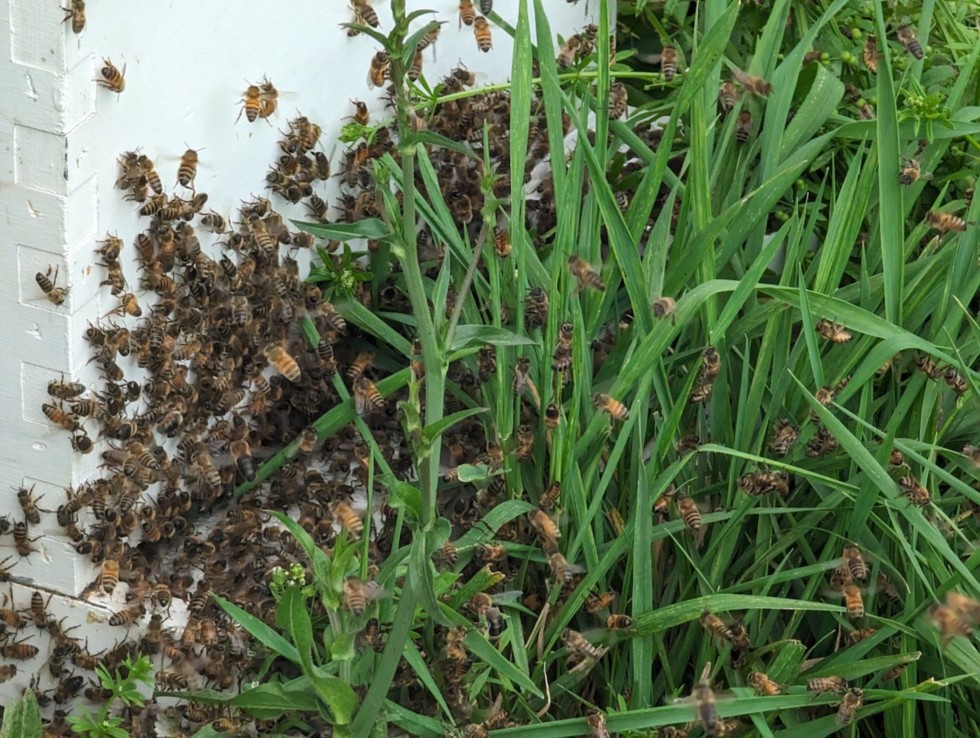 Closer inspection confirmed they were moving in. First time I've had a swarm move into an empty hive on their own vs having to capture and relocate them. Wish they were all this easy, lol
