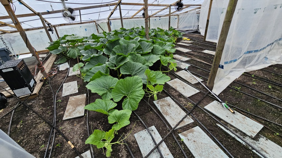 This is a side view. Longest vine on the left is a secondary. This plant is about the same size as last year which is pretty good considering that the amount of sunshine was less in May.