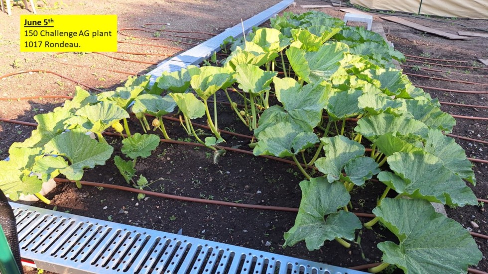 Been doing a lot of heavy trimming on the 1017 Rondeau AG plant to keep it in the 6 ft wide boundry I set up for the 150 Challenge. Main is 17 ft long, and 3rd pumpkin will be set on this plant next week. 3ft side vines need a lot of carefull anchoring to prevent them from falling over or uprooting in a wind. I guess thats why its called a Challenge.