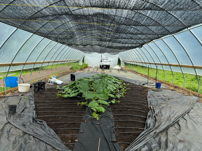 Update on the giant pumpkins in the High Tunnel . Plant closest to me is the 2154 Sperry and the plant in the background is the 2239 Marintzer. Plants are a little behind, but moving along nicely now had a late start . I also installed a retractable shade cloth.