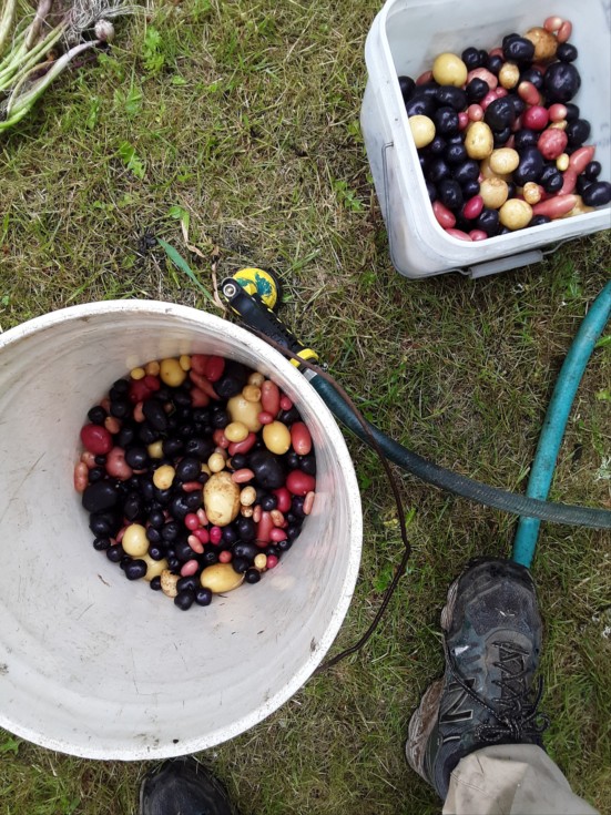 I used two buckets to wash them. The round bucket has holes in the bottom to rinse them and have the dirt flow out the holes but the potatoes stay. The square bucket, if you hold it and rotate back and forth has a washing machine agitation effect. The potatoes rub against each other and the sloshing helps remove dirt. Anyhow, it would be beyond tedious to clean all of these one at a time. But agitating the dirt off then rinsing them, then agitating them a final time... there was not a single speck of dirt or sand remaining.