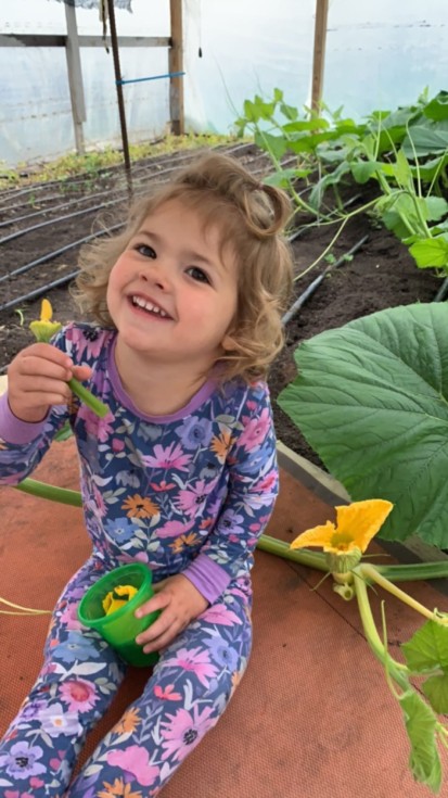 Harper was my little helper this morning pollinating our 2501 Bernstrom pumpkin! We pollinated it with the 2749 Gienger. So we'll have the largest size pumpkin ever pollinated by the world record weight pumpkin, hopefully a great all Minnesota cross! 2501 Bernstrom x 2749 Gienger.
