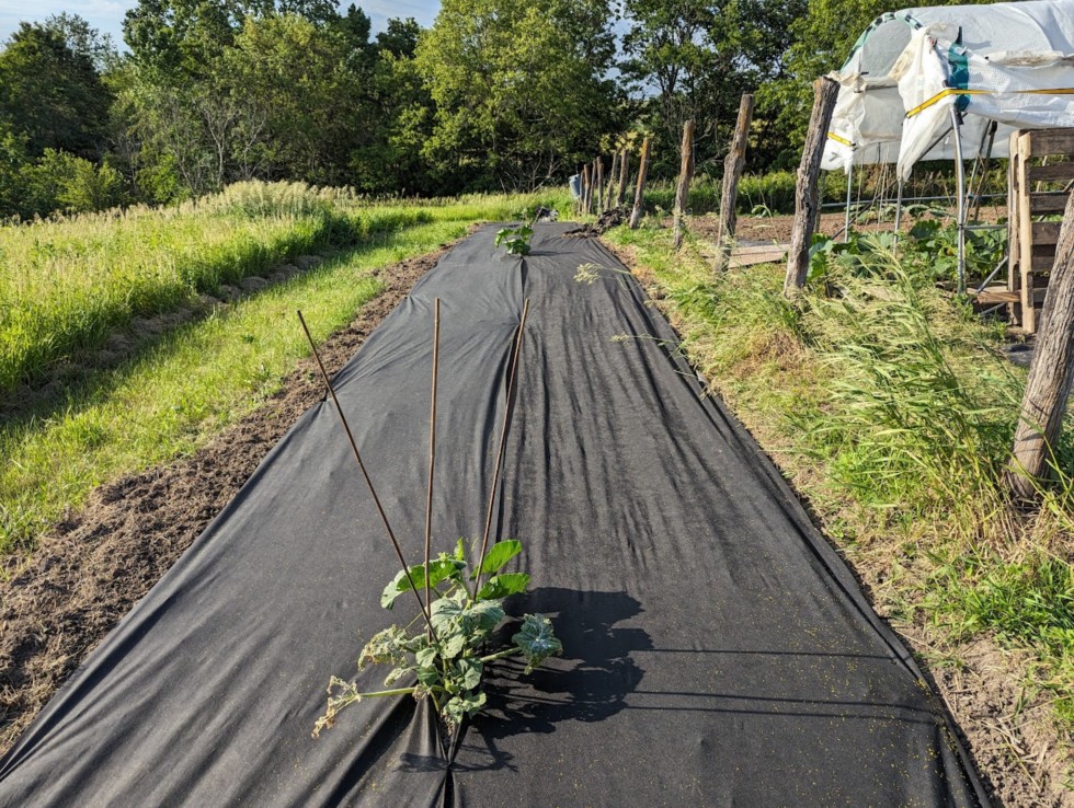 Got a couple fabric strips down for the squash genetic plants to help with weed control. Their growing area will be pretty much limited to this 8' wide prepared area and any weeds/grass to the outside of the patch