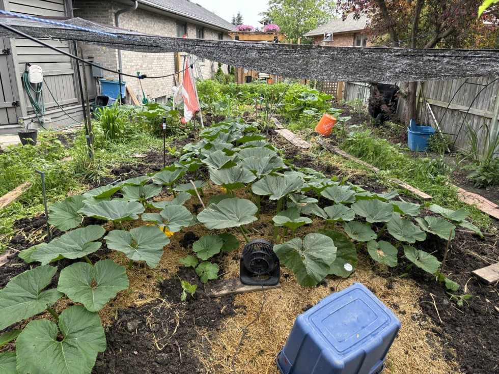 Arrow pattern secondary vines are swung back 45*. Only two terminated so very early. Now in the middle of the June heat wave. Today is day three above 90*F. Need Mother Nature to bring the thunder this afternoon. First Kelp treatment today and Cucumber Beatles have returned for round three. Sprayed and knocked them down.
