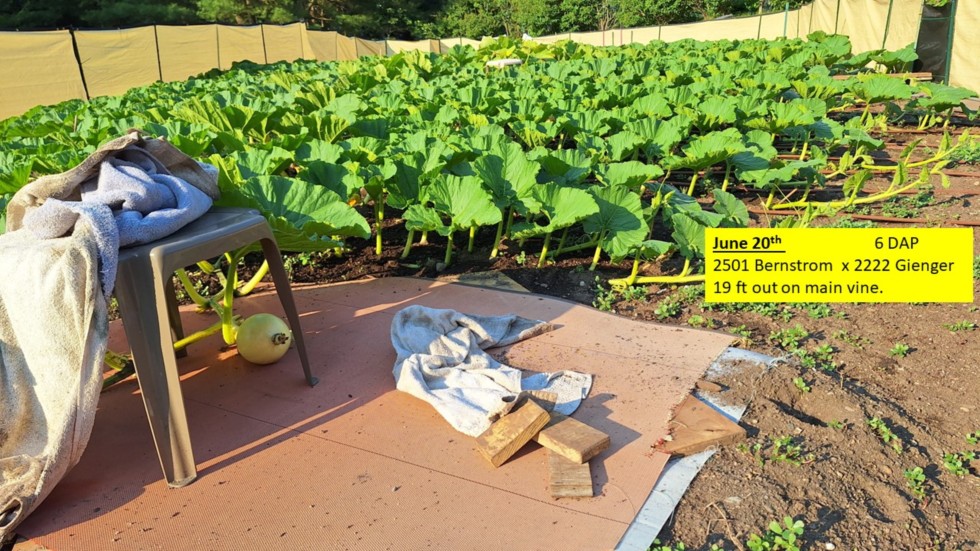 I created a level plateau to the 2501 Bernstrom x 2222 Gienger. since the pumpkin was growing on a slope. Got plywood between two pieces of mill cloth for repositioning it if necessary.