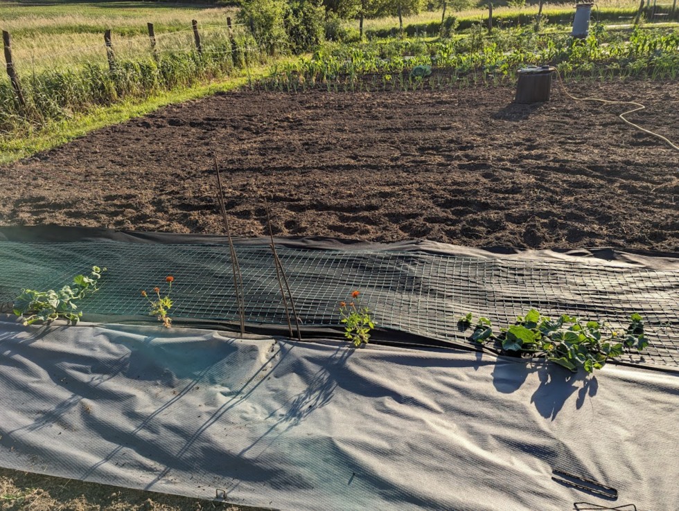 First round of fabric down and plastic snow fence for grip added for the 53.15 H/J and 71.6 English cantaloupes. In the background, but hard to see the 168.7 Baggs FP has been added to this plot.