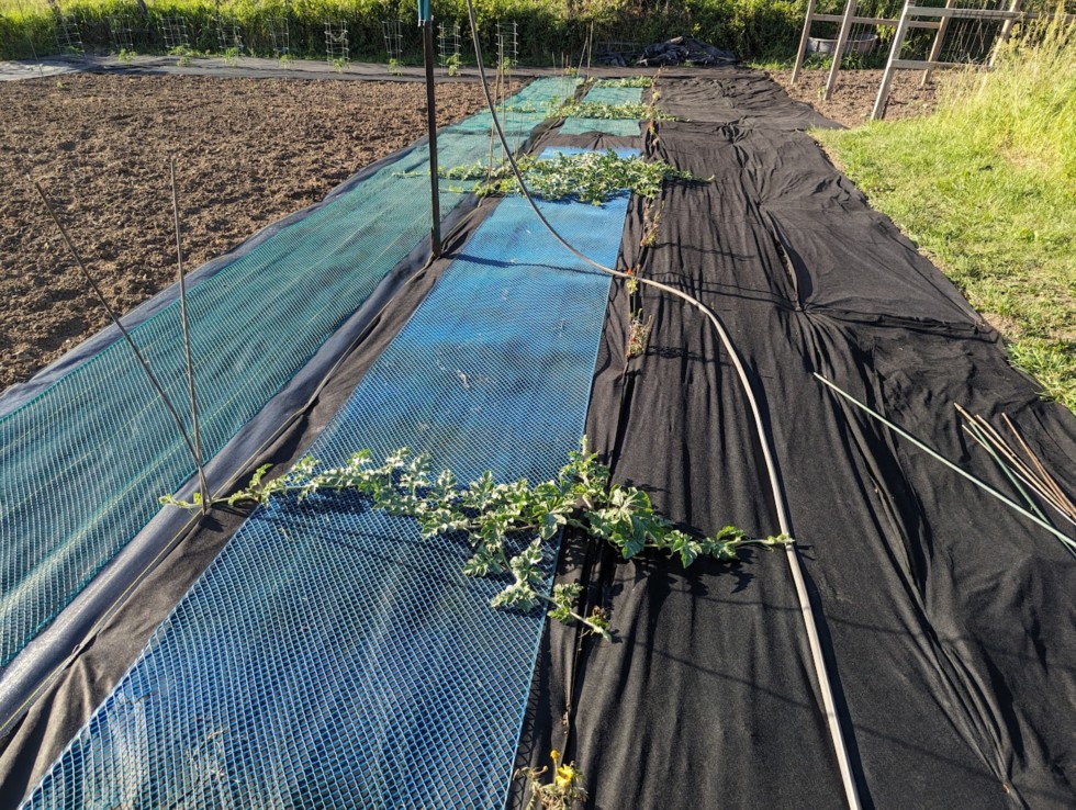 Fabric and plastic poultry fence down for the first melon plot