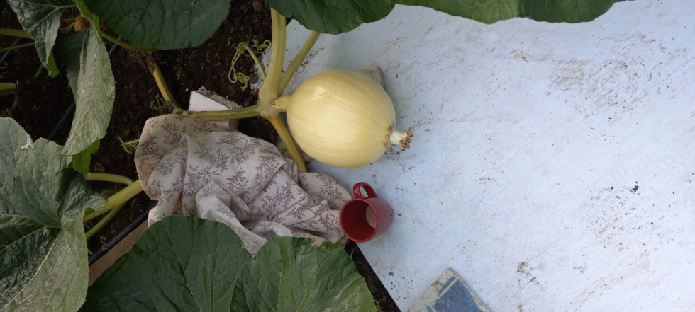 The 839 Sandercock pumpkin at day 10. About bowling ball sized. Very nice plant behind the fruit, except for a woodchuck eating the main 3 foot past this pumpkin. We will make it work to fill in the plot.