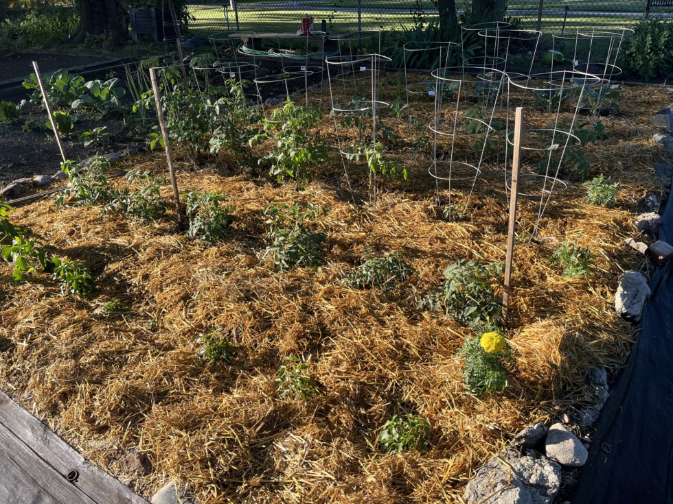 We weeded and mulched the vegetable garden. Yes this process took time, but hoping it pays off by saving us weeding time from now through Halloween. And we grow everything vertical in this garden so hopefully that eliminates any mulch mold issues. And we are extra careful and pruning lower tomato branches since they are in trenches. The garden dries out quickly and the mulch should help with moisture rentention.
