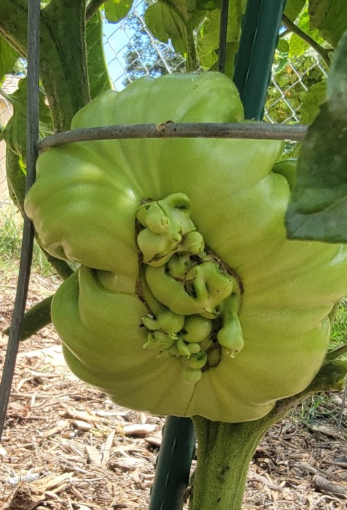 Finally a bit of good tomato news. Just visited my 10x10' community allotment and found two promising T1 fruits.... without BER. I hope I don't jinx my self, but they're looking big enough to be beyond the early BER stage. This one is from the 7.94 La Rue. The other nice fruit not shown is from Jack's 10.46. They are both approx 15 DAP. Will need to bust out the bolt cutters very soon.