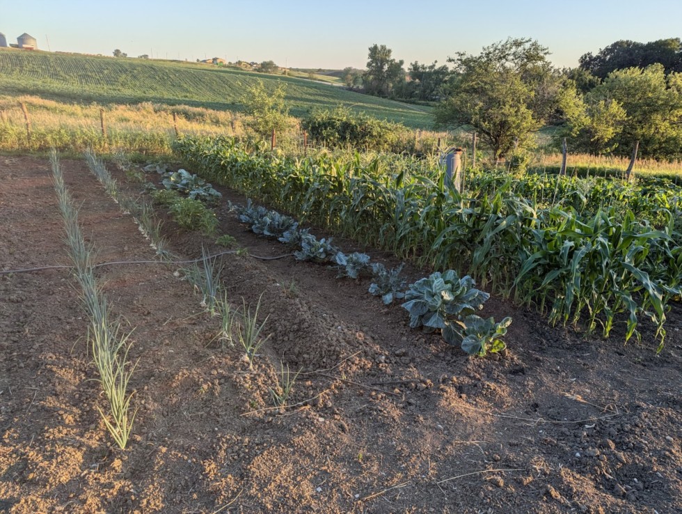 Made a mistake and bought a sprinkler with a built-in manual timer. Kids were supposed to reset each day but didn't happen so dirt on the main garden is pretty dry after last week's weather. Plants with good roots pulled though ok, but smaller plants struggled. Had 3 variety of potatoes planted. The red potatoes, which were just out of range of the neighboring sprinkler all died while the next few hills of the next variety are still barely kicking. The 3rd variety looks fairly healthy still. First sweet corn planting starting to tassel. Seeing some coon tracks on the fabric around the garden so time to break out the traps to protect the patch.