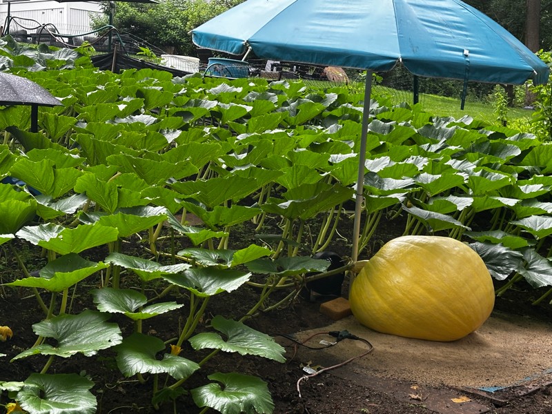 A very solid pumpkin with a lot of plant behind her! With the humidity creeping up I need to watch out for disease problems. I'll be treating