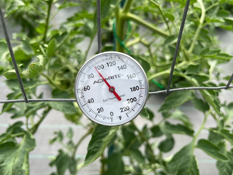 This weekend gave me the time to test the soil temperature under my fabric to see if it is heating my roots too much.