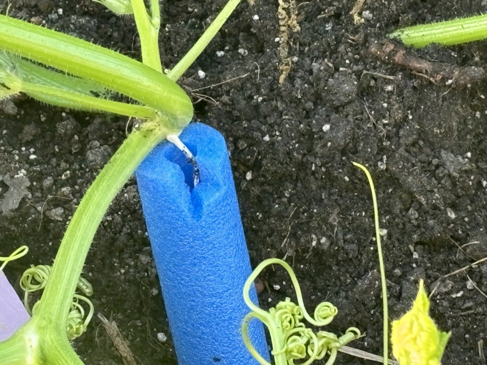 Pool noodle for the root nearest the pumpkin node. Later it was filled with potting mix.