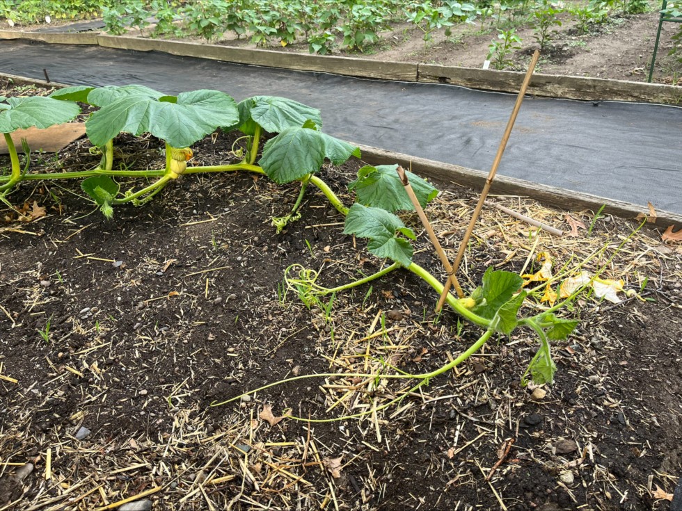 Second night in a row that I forgot to bring down the plastic cover for the pollinated pumpkin. Assuming it takes, unlike last year the pumpkin will be on the inside of the curved main-which could get a bit tight. But, I will not need nearly as much of a curve as most other growers.