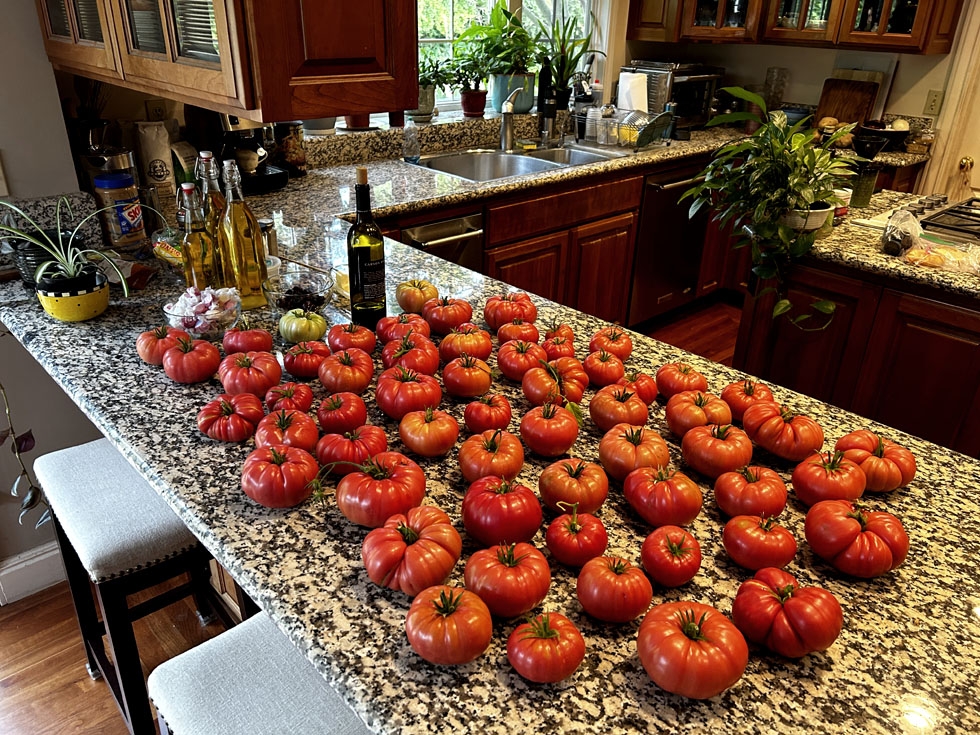 The Red Tide � I'm gonna need a little help here. I've harvested a total of 88 pounds of Solanum Lycopersicum so far. The biggest one is just under 2 pounds. There's an additional 20 pounds of ripe Pink Brandywines now on the vines with a lot more still to come...