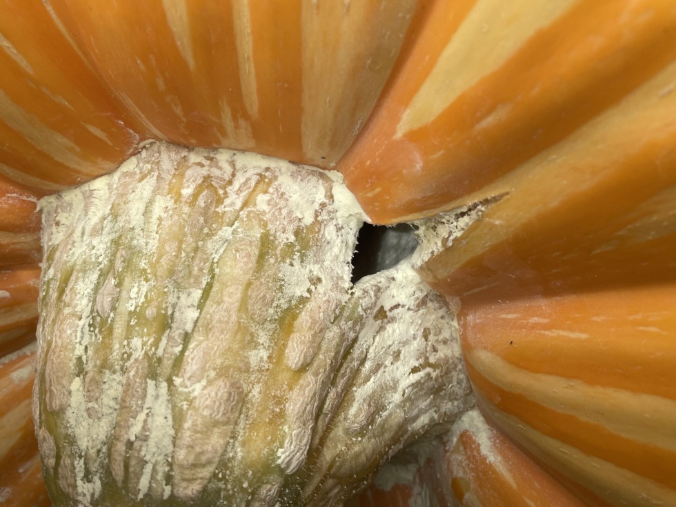 My 2245 has developed 2 stem splits. This one pictured is on the top. There is a smaller one on the bottom. It has grown a bit in the last few days. We don't get rain this time of year and I turned off my overhead water. Just using g drip now. I am concerned about it tearing further into the pumpkin.