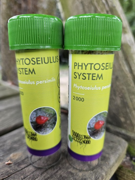 Last auxiliaires introduction against spidermites. We had high temps up to 36.3C which is ideal condition for them. They love hot and dry weather under polytunnel. The previous introductions did a very good job as usual, no signs of spidermites at all so far. I know that every year about mid august, spidermites are trying again to come back so spreading one more time the predators are very useful. They are severals diff�rent strains to fight spidermites but I really like this one cos it prevents and cure the problem.