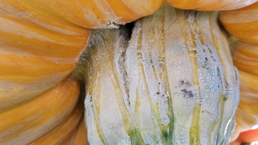 Yesterday I decided to lengthen the slit by about 1/2". The fine line past the crack is the new cut. It's definitely widening as the pumpkin is growing.