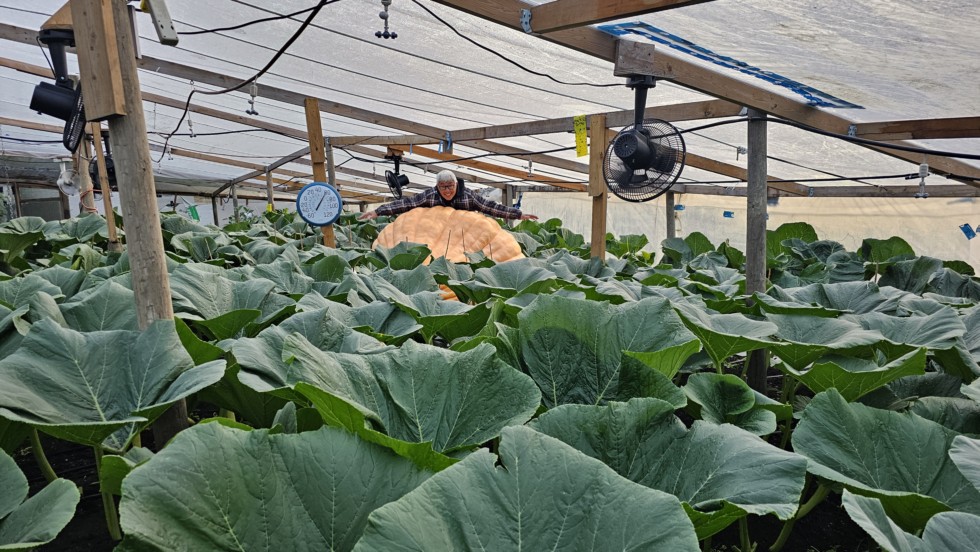 This a picture of the 2404 Barron growing inside the greenhouse. The PM had started inside 2 weeks before the outside plant. I was trying to be proactive and had sprayed the plant 6 times with agricultural grade fungicides. As with past growing years I knew that those fungicides would only slow the PM but not stop or eradicate it. This year was no different. The PM continued to develop. Since this year I wasn't going to grow a pumpkin( but I did!!), I experimented with a few different things and on Aug 2nd I gave the plant a heavy spray of "Hygropunch" oil fungicide delivered through my overhead mister system. 16 days later there is no sign of PM !! About a week after the initial spray, I could see the "shadow" areas of where the Hygropunch had not reached the leaves. I hand sprayed those areas. I have never had such a clean looking plant. My biggest worry using the oil was clogging the stomata or some other function of the plant and slowing the pumpkin growth. BUT... since Aug 2nd the pumpkin has gained over 400 lbs !!