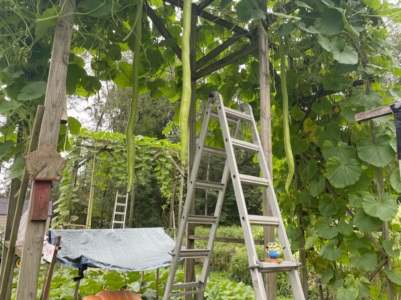 We have 3 long gourds on a very healthy 159 Jutras long gourd. They are all sound 20 days and all are between 7 and 8 feet long.