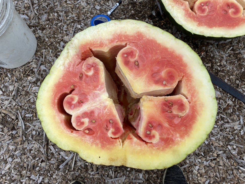 167 Holloway. This one would have gone heavy to the charts with that thick rind and lots of flesh. It must have been pollinated with a white seeded melon, as the seeds are not black.