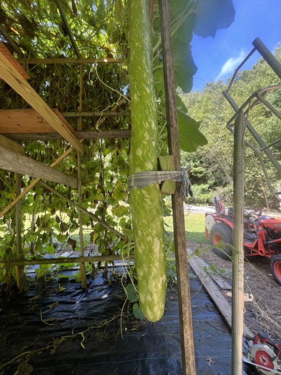 As the gourd gets to be about eight feet long i put a pice of wood along side of it to prevent it from swaying in the breeze, I tied it loosely with a cloth and keep an eye on it. You have to move the cloth every other day as the gourd grows. Right now it's doing about 2 1/2� per day at about 130�