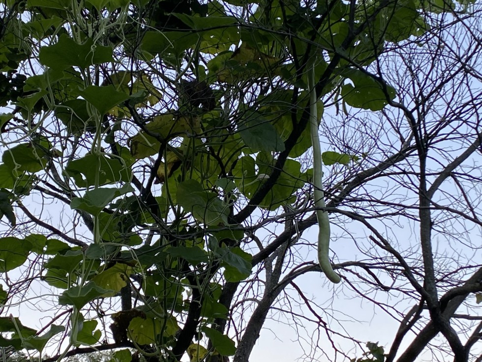 I finally have a long gourd set on my long gourd planted under the dead tree. Not sure if there is still time to get this before the Durham fair or not. But it is growing fast. Summer has currently left us. We are in fall weather right now.