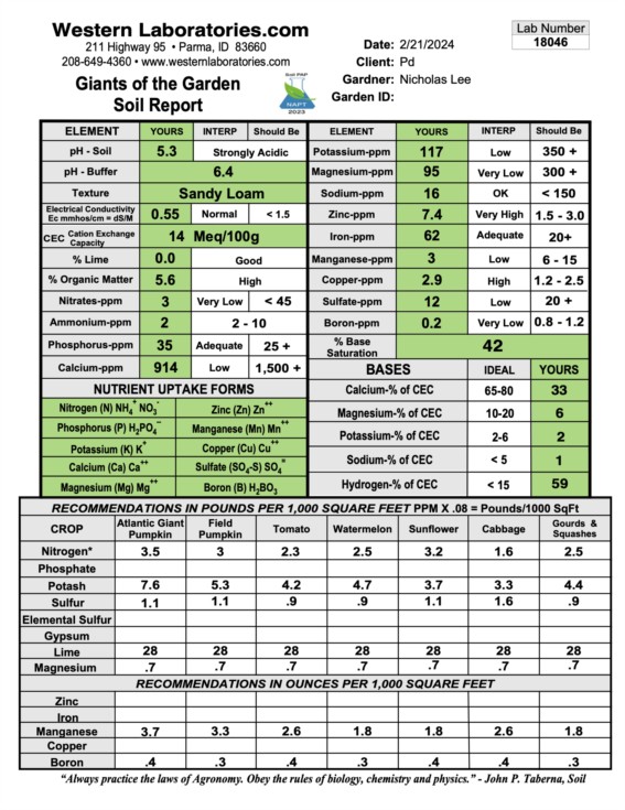 Here is my soil test from February of this year. Before you look at my PH you might want a barf bucket nearby. I amended it per the recommendations of Matt D and John Taberna and now we're working with...